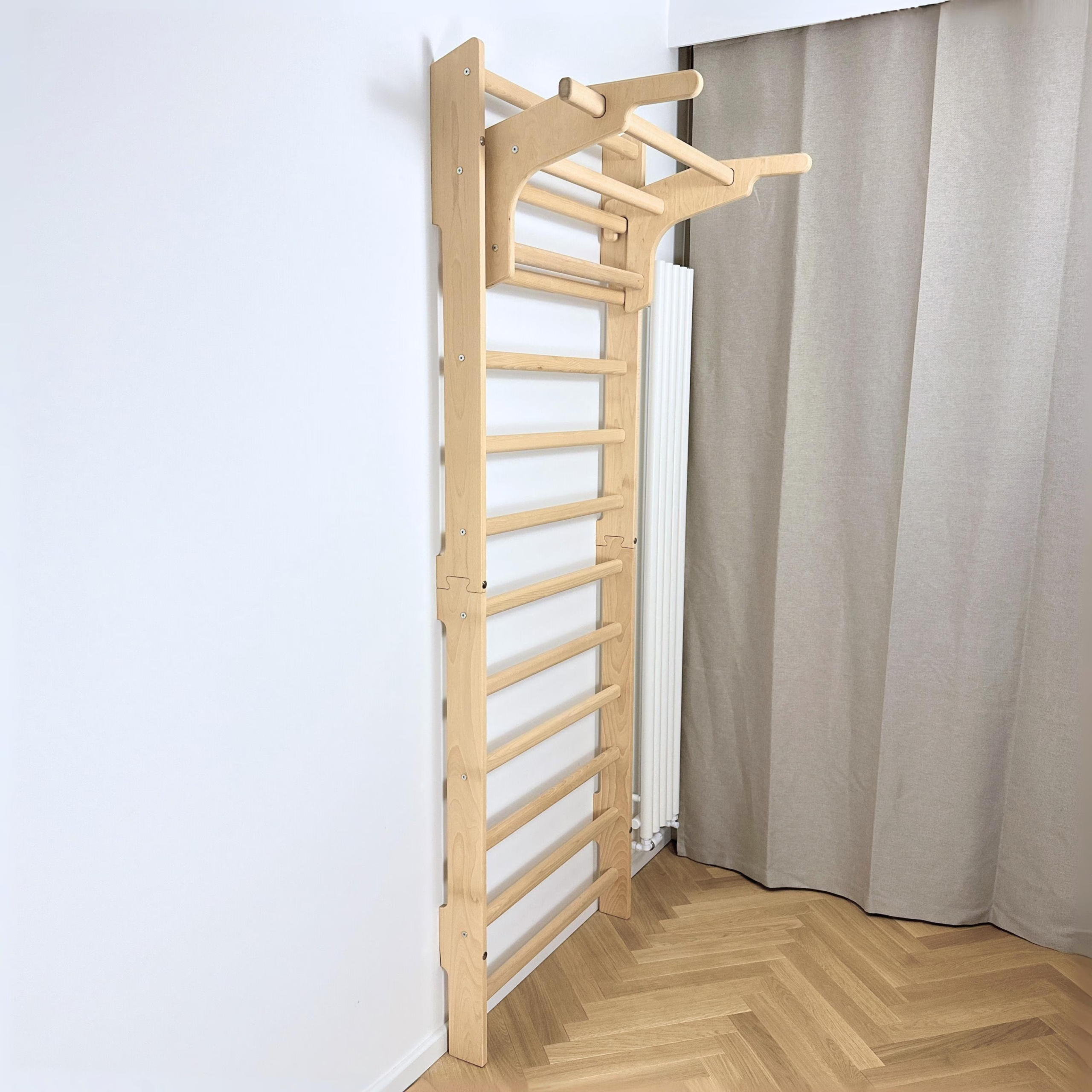 The WhiteOak Swedish Ladder is a solid, precisely crafted wall-mounted ladder designed for both adults and children. Perfect for home gyms, physiotherapy studios, or kids’ rooms, it combines functionality, minimalist design, and premium materials — becoming both a training tool and an elegant interior element.