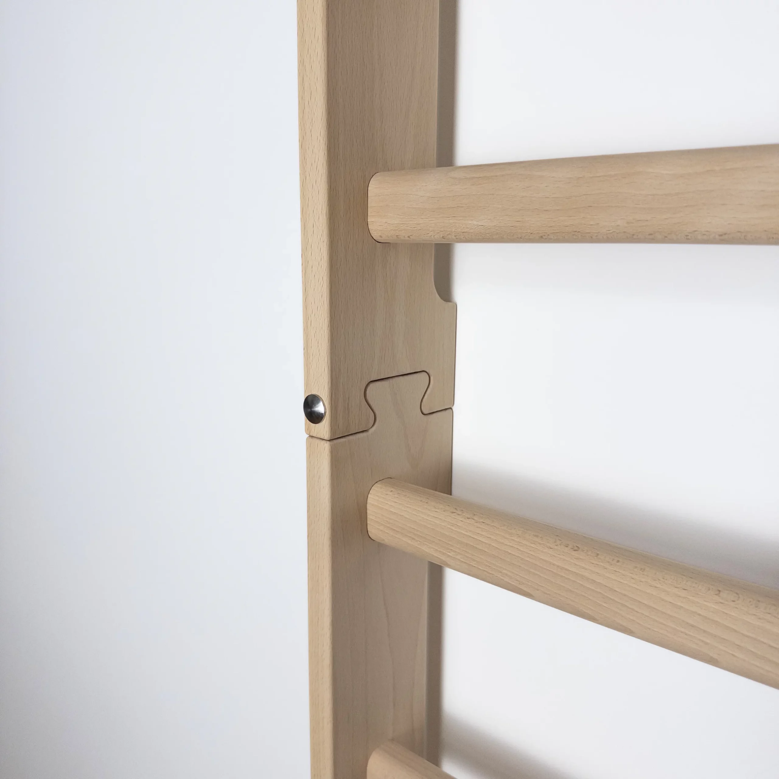 Zastosowane autorskie łączenie belek pozwala na montaż w dwóch częściach, dzięki czemu drabinka jest znacznie łatwiejsza w transporcie i instalacji — mieści się w standardowej paczce kurierskiej, a po złożeniu tworzy wyjątkowo stabilną, jednolitą całość.